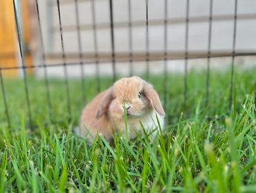 Benji is a sweet bunny who loves his time outside. Benji was purchased from DTL Rabbitry. He is a fully pedigreed, broken orange, vm, blue-eyed Holland Lop. He is one of the best-looking bunnies in our rabbitry with his wide head and beautiful coloring. He joined us in 2021 when he was just a little guy. Since then he has sired many litters and will have many more in the future. I love the way he greets me every morning with that excited look on his face. I am so glad to have him as part of our rabbitry.